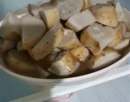 7.当素鸡片粘满油,倒入煎好的五花肉中,用锅中剩余的油炒郫县豆瓣酱至出红油,再倒入煎好的五花肉片、素鸡等,翻炒均匀,放入鸡精调味,即可出锅。