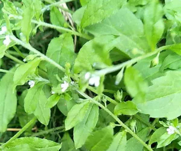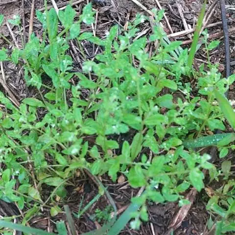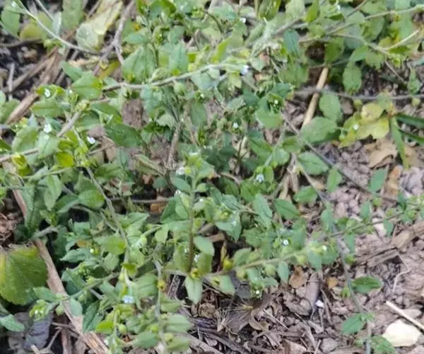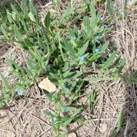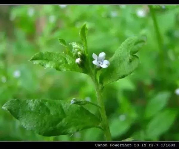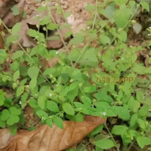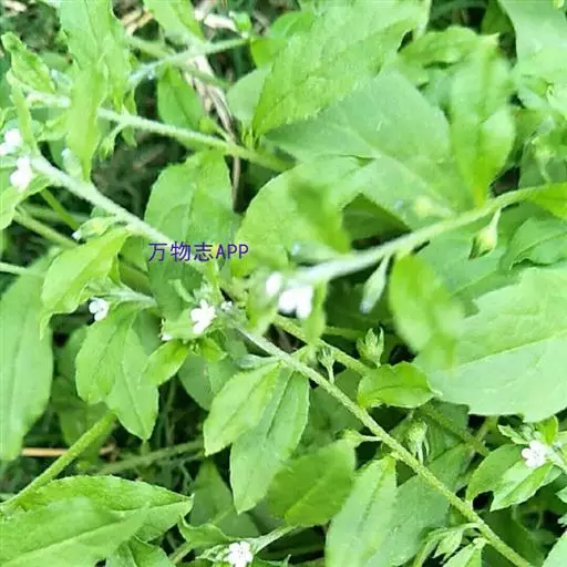一年生草本,高15-30厘米。茎细弱,丛生,直立或平卧,多分枝,被向上贴伏的糙伏毛。叶椭圆形或狭椭圆形,长1-2.5厘米,宽0.5-1厘米,先端钝,具小尖,基部宽楔形,上下两面被向上贴伏的糙伏毛或短硬毛。花序柔弱,细长,长10-20厘米;苞片椭圆形或狭卵形,长0.5-1厘米,宽3-8毫米,被伏毛或硬毛;花梗短,长1-2毫米,果期不增长或稍增长;花萼长1-1.5毫米,果期增大,长约3毫米,外面密生向上的伏毛,内面无毛或中部以上散生伏毛,裂片披针形或卵状披针形,裂至近基部;花冠蓝色或淡蓝色,长1.5-1.8毫米,基部直径1毫米,檐部直径2.5-3毫米,裂片圆形,长宽约1毫米,喉部有5个梯形的附属物,附属物高约0.2毫米;花柱圆柱形,极短,长约0.5毫米,约为花萼1/3或不及。小坚果肾形,长1-1.2毫米,腹面具纵椭圆形的环状凹陷。花果期2-10月。