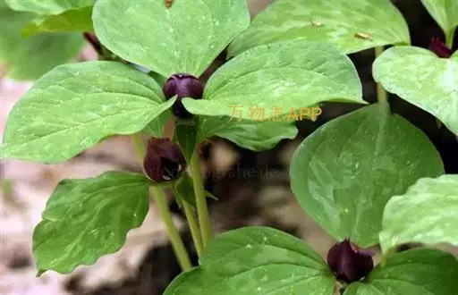 茎丛生于粗短的根状茎上,高15-50厘米。叶菱状圆形或菱形,长6-15厘米,宽5-15厘米,近无柄。花梗长1-4厘米;外轮花被片卵状披针形,绿色,长1.5-2厘米,宽5-9毫米,内轮花被片白色,少有淡紫色,卵状披针形,长1.5-2.2厘米,宽4-6(-10)毫米;花柱长4-5毫米;花药长3-4毫米,短于花丝或与花丝近等长,顶端有稍突出的药隔;子房圆锥状卵形,长7-9毫米,宽5-7毫米。浆果圆球形,直径1.5-1.8厘米,黑紫色,有多数种子。花期4-6月,果期7-8月。