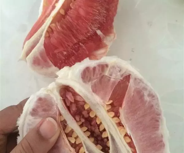 果圆球形,扁圆形,梨形或阔圆锥状,横径通常10厘米以上,淡黄或黄绿色,杂交种有朱红色的,果皮甚厚或薄,海绵质,油胞大,凸起,果心实但松软,瓢囊10-15或多至19瓣,汁胞白色、粉红或鲜红色,少有带乳黄色;种子多达200余粒,亦有无子的,形状不规则,通常近似长方形,上部质薄且常截平,下部饱满,多兼有发育不全的,有明显纵肋棱,子叶乳白色,单胚。
