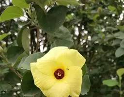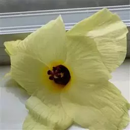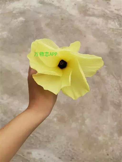 一年生或多年生草本,高1-2米,疏被长硬毛。叶掌状5-9深裂,直径15-30厘米 黄蜀葵 ,裂片长圆状披针形,长8-18厘米,宽1-6厘米,具粗钝锯齿,两面疏被长硬毛;叶柄长6-18厘米,疏被长硬毛;托叶披针形,长11-1.5厘米。花单生于枝端叶腋;小苞片4-5,卵状披针形,长15-25毫米,宽4-5毫米,疏被长硬毛;萼佛焰苞状,5裂,近全缘,较长于小苞片,被柔毛,果时脱落;花大,淡黄色,内面基部紫色,直径约12厘米;雄蕊柱长1.5-2厘米,花药近无柄;柱头紫黑色,匙状盘形。蒴果卵状椭圆形,长4-5厘米,直径2.5-3厘米,被硬毛;种子多数,肾形,被柔毛组成的条纹多条。花期8-10月。