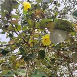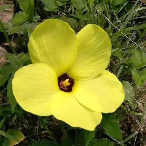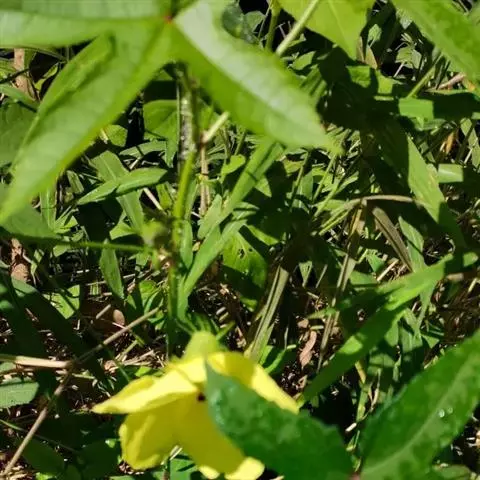 黄蜀葵,别名:秋葵、棉花葵、假阳桃、野芙蓉、黄芙蓉、黄花莲、鸡爪莲、疽疮药、追风药、豹子眼睛花、荞面花,拉丁文名:Abelmoschus manihot (Linn.) Medicus ,锦葵科、秋葵属一年生或多年生粗壮直立草本植物。茎被黄色刚毛。叶大,卵形至近圆形。花期6~8月。原产我国南方。常生于山谷草丛、田边或沟旁灌丛间。分布于印度。