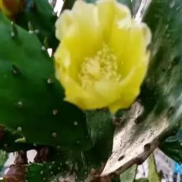 单刺仙人掌(Opuntia monacantha (Willd.) Haw.)仙人掌科肉质灌木或小乔木,高1.3-7米,老株常具圆柱状主干。分枝开展,先端圆形,嫩时薄而波皱,鲜绿而有光泽,无毛;小窠圆形;刺针状,灰色,具黑褐色尖头,刺长达7.5厘米;短绵毛灰褐色;倒刺刚毛黄褐色至褐色,有时隐藏于短绵毛中。叶钻形,绿色或带红色,早落。花辐状,直径5-7.5厘米;花托绿色,无毛;萼状花被片深黄色;瓣状花被片深黄色,倒卵形至长圆状倒卵形;花丝淡绿色;花药淡黄色。浆果梨形或倒卵球形,无毛,紫红色,每侧具小窠,小窠突起,通常无刺。种子多数,肾状椭圆形,淡黄褐色,无毛。花期4-8月。