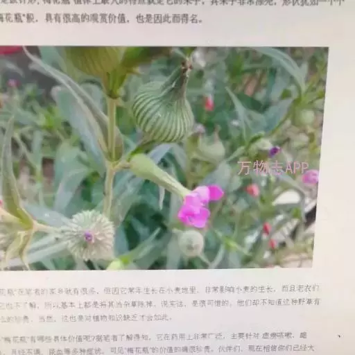 麦瓶草:一年生草本,高20-60cm。全株被腺毛。主根圆柱细长。茎直立,节明显而膨大,叉状分枝。基生叶匙形;茎生叶对生,椭圆披针形或披针形,长5-8cm,宽5-10mm,先端钝尖,基部渐窄,全缘。花两性;1-3朵成顶生及腋生聚伞花序,花梗细长;花萼长锥形,上端窄缩,下部膨大,有30条明显细脉,先端5齿裂;花瓣5,粉红色,三角倒卵形,长于萼,喉部有2鳞片;雄蕊10;子房上位,花柱3,细长。蒴果卵形,3-6齿裂或瓣裂,包围于长锥形宿萼中。种子肾形,有成行的瘤状突起,以种脐为圆心,整齐排列成数层半环状。花期4-5月,果期5-6月。