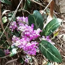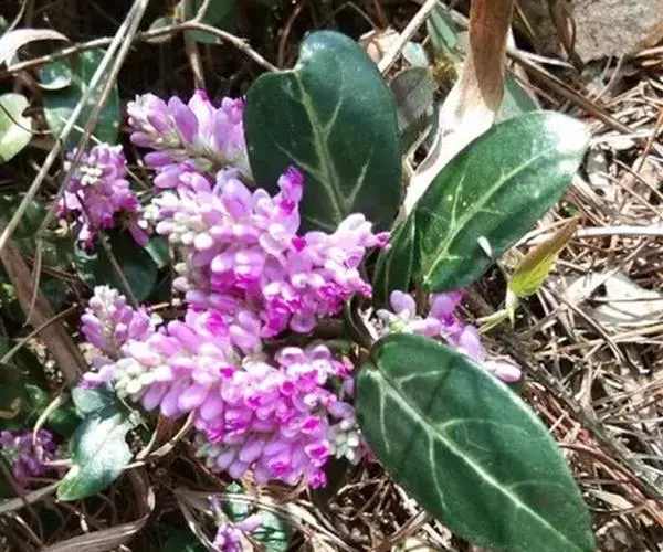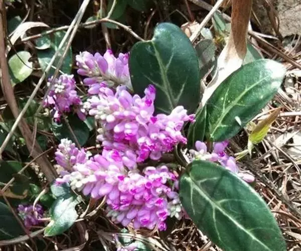 总状花序顶生,长2.5-3厘米,花序轴被短柔毛,花多而密;花长约10毫米,花梗长约2毫米,无毛,基部具1苞片,苞片长圆状卵形,长约2毫米,先端渐尖,具缘毛,花时不脱落;萼片5,花后脱落,外面3枚椭圆形,长约3毫米,先端钝,无毛,内面2枚椭圆状卵形,长约7毫米,宽约3.5毫米,先端圆形,具5脉;花瓣3,紫红色,长约9毫米,侧生花瓣与龙骨瓣几等长,并于1/2以下合生,先端圆形,龙骨瓣具2深裂片状的鸡冠状附属物;雄蕊8,花丝长约7毫米, 5/7以下合生成鞘,分离部分丝状,花药卵形;子房圆形,径约1毫米,具翅,无毛,基部具花盘,花柱长7毫米,由下向上逐渐增粗,并弯曲,顶端喇叭状2浅裂,柱头生于上裂片内。