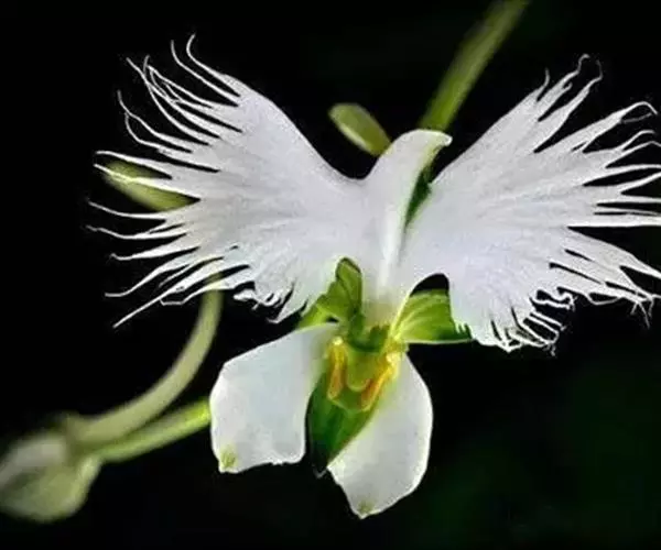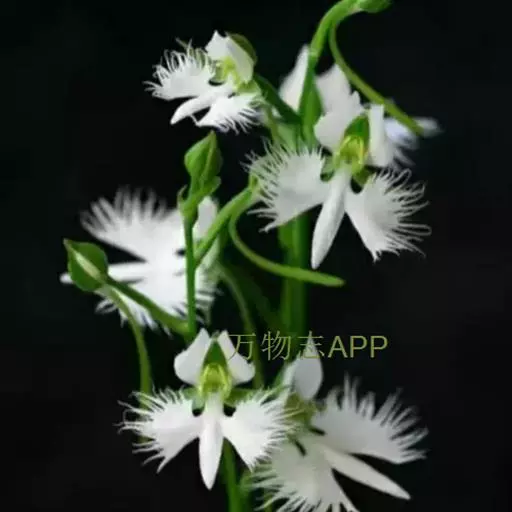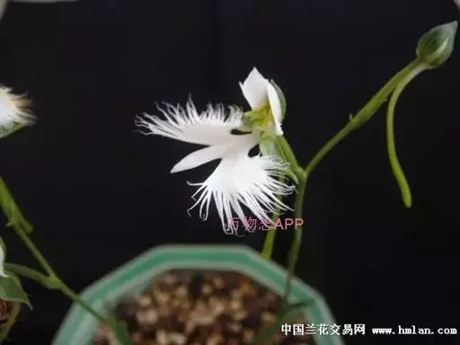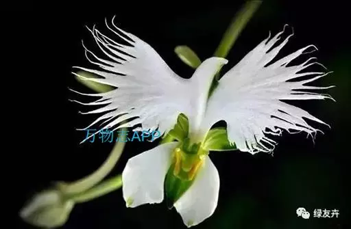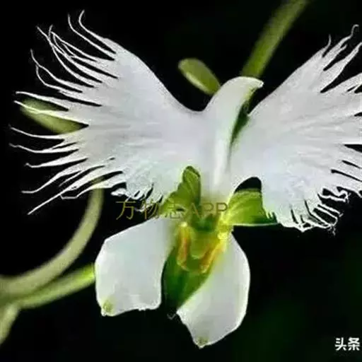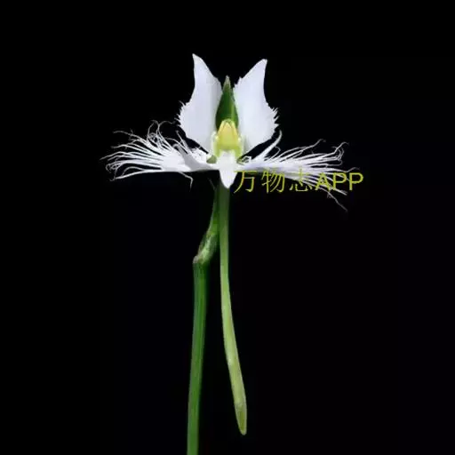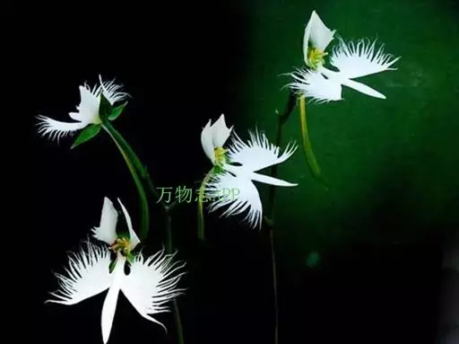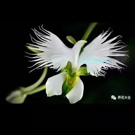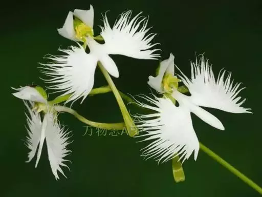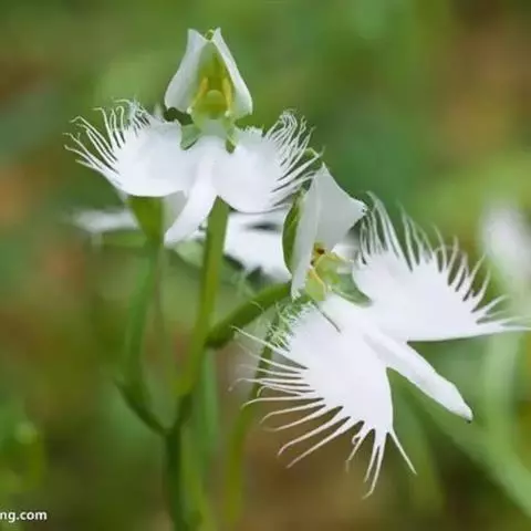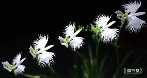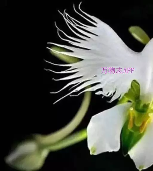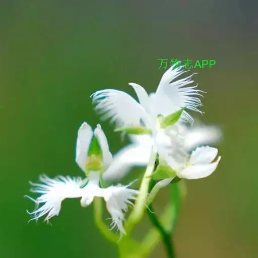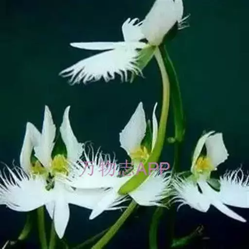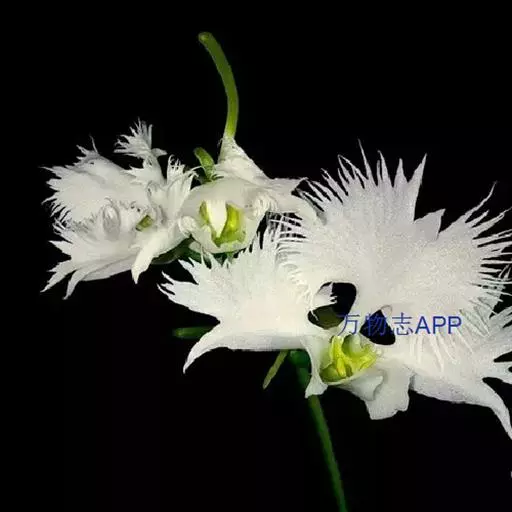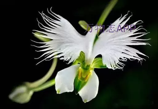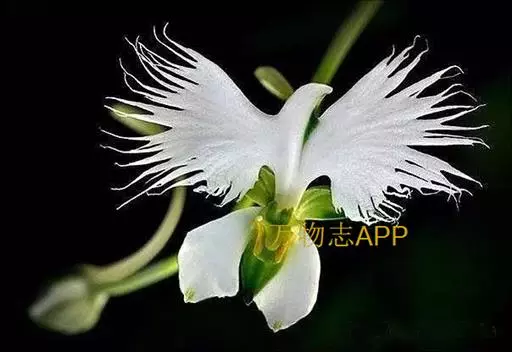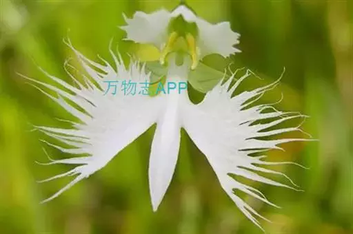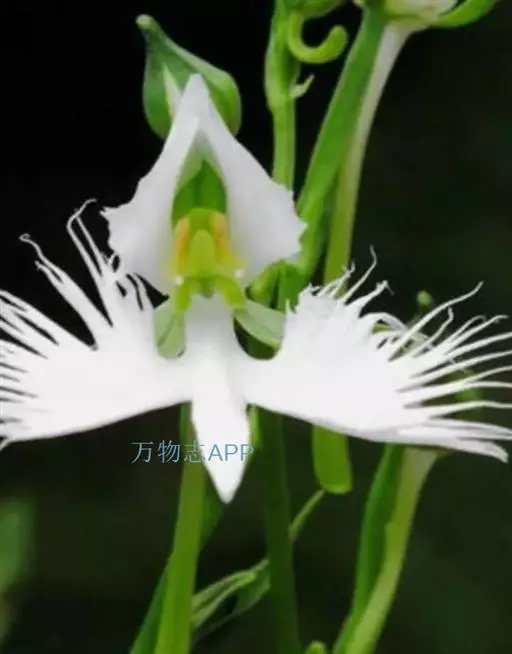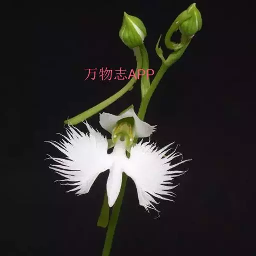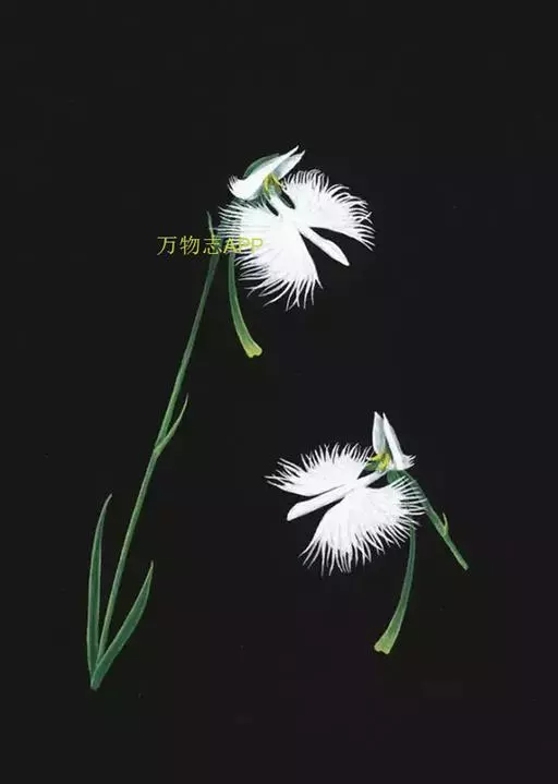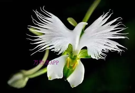 狭叶白蝶兰(学名:Pecteilis radiata (Thunb.) Rafin.):植株高18-35厘米。块茎椭圆形或近球形,肉质。茎细长,直立,基部具3-5枚叶。叶片线形,长5-10厘米,宽3-6毫米,向上伸展,先端渐尖,基部成抱茎的鞘。总状花序具1-2朵花;花较小,直径约1.5-3厘米,白色;萼片淡绿色,狭卵形;花瓣白色,斜卵形,直立,长10-12毫米,先端近急尖,外侧边缘具齿或浅的流苏,与中萼片靠合呈兜状;唇瓣白色,短楔形,长约巧毫米,3深裂。花期7-8月。