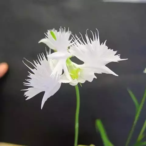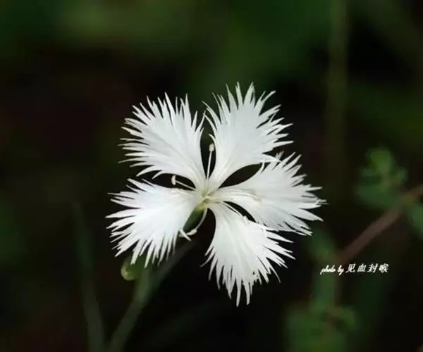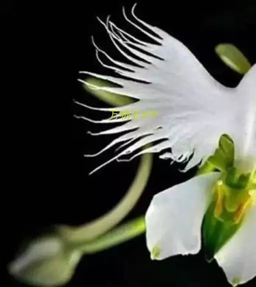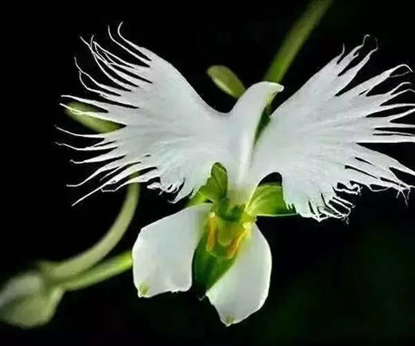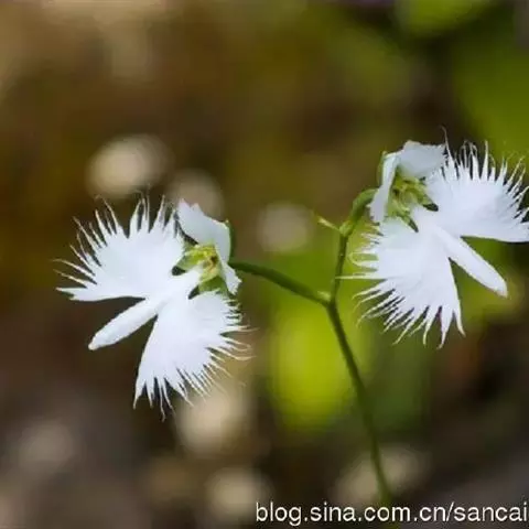 花瓣白色,斜卵形,直立,长10-12毫米,先端近急尖,外侧边缘具齿或浅的流苏,与中萼片靠合呈兜状;唇瓣白色,短楔形,长约巧毫米,3深裂;侧裂片较中裂片宽大,斜扇形,外侧边缘具长流苏状裂条,中裂片线形,长约1厘米,宽约2毫米,全缘,先端稍钝,具3脉;基部距狭圆筒状,长3-4厘米,下垂,向末端稍渐增粗。花期7-8月。