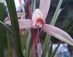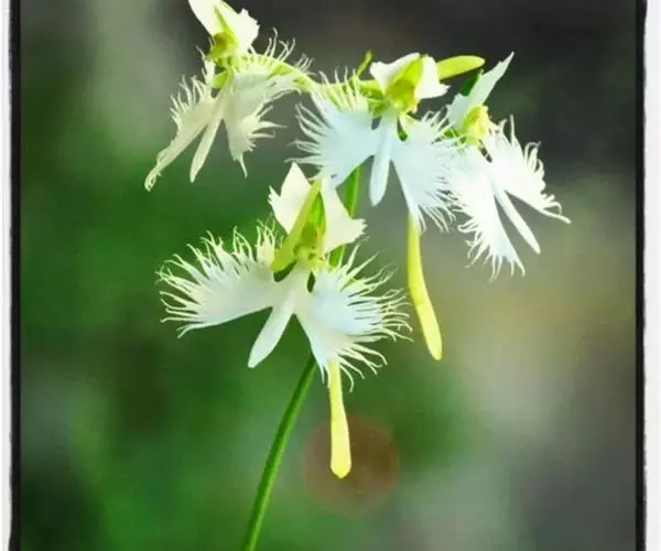 总状花序具1-2朵花;花苞片披针形,长7-12毫米,较子房短,先端渐尖;子房细圆柱形,扭转,无毛,连花梗长1.3-1.5厘米;花较小,直径约1.5-3厘米,白色;萼片淡绿色,狭卵形,长8-10毫米,先端钝,具5-7脉,中萼片近直立,侧萼片张开,偏斜。