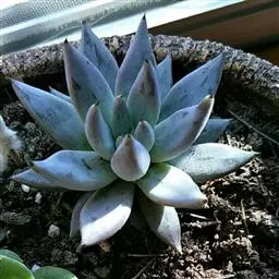 三月日美人为景天科厚叶草属一种多年生灌状肉质植物,为大家喜爱的肉肉美人系列品种之一,老茎木质化,直立,浅褐色带黄,茎高可达20厘米,直径约1厘米,肥厚饱满的肉质叶在老茎的枝端排列呈莲座状,卵形叶,具不明显的短叶尖,少被白色蜡质涂层,蓝绿色的叶片外缘在出装后呈粉红至紫红色;小花倒钟形,猩红色,在温暖的冬季至春季盛开。 三日月美人