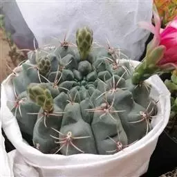 绯花玉 Speg.)是仙人掌科、裸萼球属多肉植物,植株呈扁球形,表皮墨绿色,刺针状,…