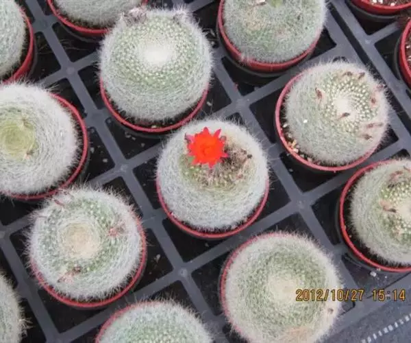 松霞是仙人掌科乳突球属的多年生肉质植物。单个球体小,呈圆筒状,暗绿色,疣状突起小,呈圆形,刺座无毛,…