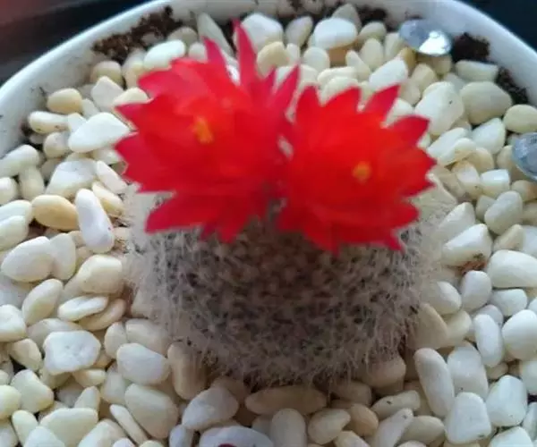 白雪光为南国玉属多年生肉质植物。茎球形或稍扁圆形,高约10厘米左右,单生,直径为6至10厘米,有小疣状突起,呈螺旋状排列,球体密生3至5毫米的放射形白刺,中心刺淡黄色。花顶生,漏斗状,绯红色,花从白刺中深出,十分美丽耐观。单花朵可开2周以上,连续花期3个月左右,颇具观赏价值。栽培品种中还有黄雪光,球体与白雪光相似,刺黄色,较长,花黄绿色,常数朵同时开放,较为珍贵。