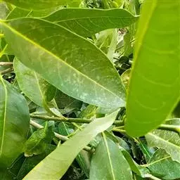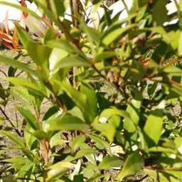 大乔木,高25米;树皮平滑,暗灰色,片状脱落,树干基部有宿存树皮;嫩枝圆形,最嫩部分略有棱。幼态叶对生,叶片阔披针形,长6-9厘米,宽2.5-4厘米;成熟叶片薄革质,狭披针形至披针形,长6-30厘米,宽1-2厘米,稍弯曲,两面有黑腺点,侧脉以45度角斜向上,边脉离叶缘0.7毫米;叶柄长1.5-2.5厘米,纤细。