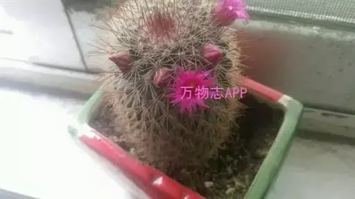仙人掌科乳突球属,植株单生,圆筒状,高30cm,直径1Ocm。茎无白色乳汁 猩猩球 。疣突腋部有绵毛及刺毛。辐射刺20~30,常为白色,也有黄、褐或红色者;中刺7~15,针形,其中1根有钩。花浅红至紫红,直径1.5cm。