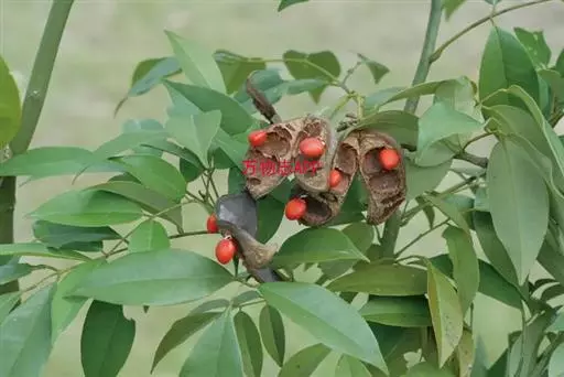 红豆树 红豆树结实年龄迟,且有大小年之分。选择生长健壮50年以上的天然林或30年以上人工林的优良母树进行采种。当荚果成熟,快要开裂时,爬上母树用高枝剪钩取果枝,收集荚果,采回的荚果,稍加暴晒后放室内摊开,使荚果自然开裂脱粒,收集种子,阴干后放入器皿或布袋内贮存。种粒大,千粒重200~250克,场圃发芽率可达70%。
