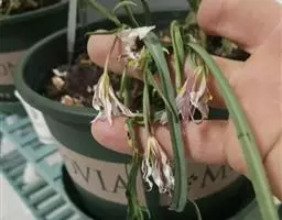 宫灯百合易受盐分高的影响,尤其是钠盐。这种情况在人工基质中比在土壤中更易发生。盐分太高会导致缺水,建议从栽植后第17周每天灌水20-30分钟,使用电导率仪定期检测土壤电导率。盐分高在植株的症状表现为黄叶,生长弱,叶子变褐甚至全部失绿。失绿的植株经常被错认为感病。这种失绿更可能是离子浓度过高而造成的,且不是感病。定植后前8周从顶部浇灌,接下来9周改变球座带,种植17周后,停止浇水。停水4-6周后采收种球,浇水时候一定要注意水的多少,不得超出20公分。