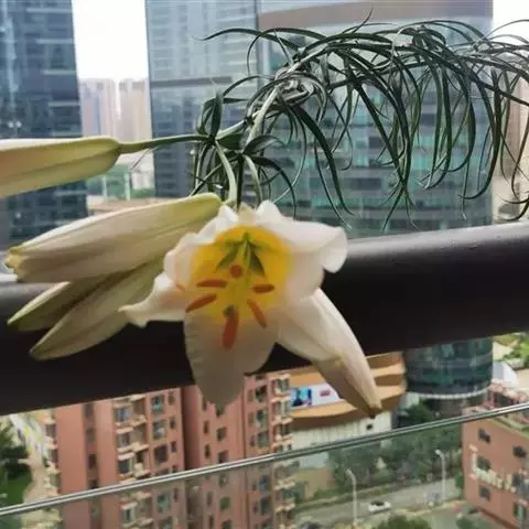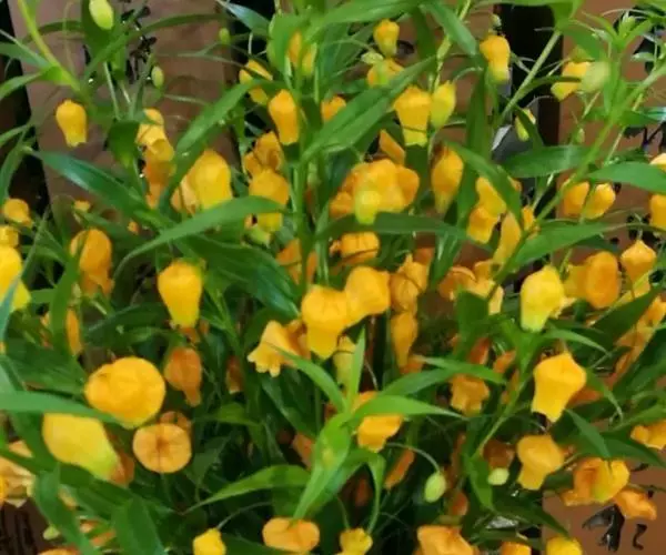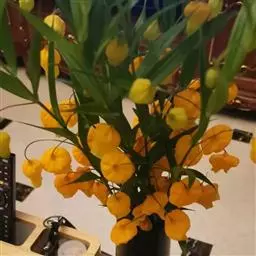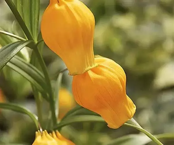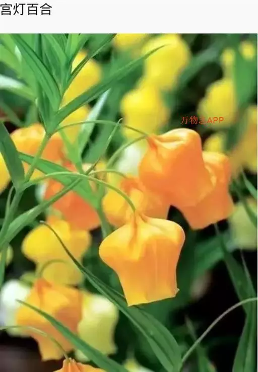 宫灯百合(学名:Sandersonia aurantiaca Hook.):仅一属一种。为多年生球根草本,由于其花形花色酷似中国宫灯而得名,多年生球根草本,半蔓性,高约1米。叶轮状互生,无柄,叶面光滑,柳叶形,长约5~10厘米,宽约2~3厘米,有3条深刻纹。 花坛状,形似宫灯,亮橙黄色,上阔下窄,宽处约2厘米,花柄约5厘米,下垂,腋生,有短裂片6,雄蕊6,花药丁字形,花柱三裂。7月~翌年1月,从仲夏到秋冬。瓶插寿命可达2~3周。蒴果3瓣,胞背开裂。