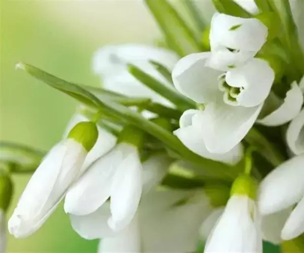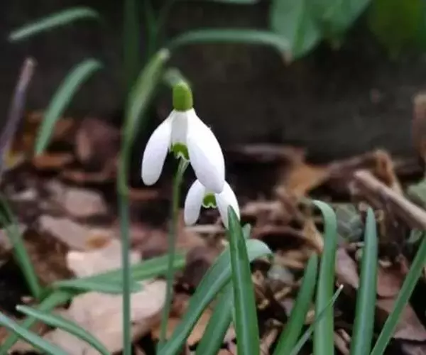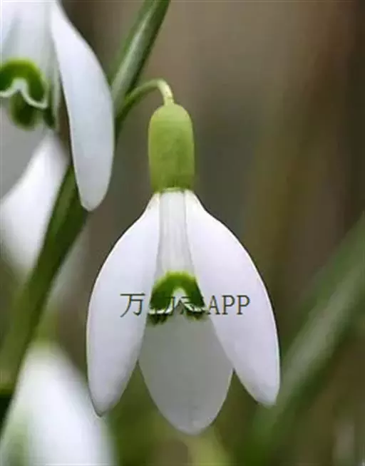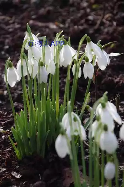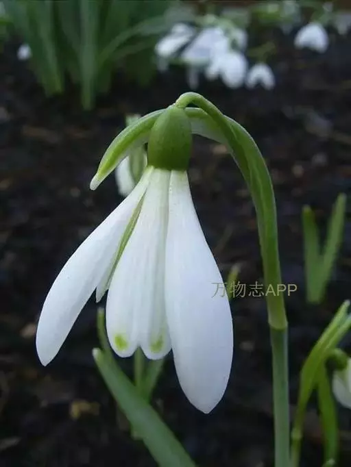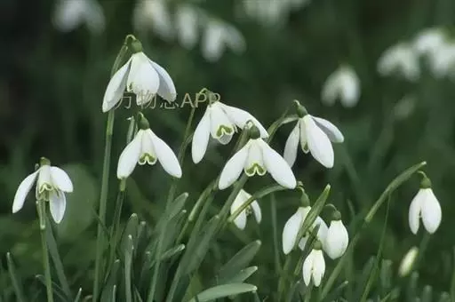 雪滴花(学名:Galanthus nivalis Linn.)是石蒜科,雪滴花属多年生草本植物,株高可达30厘米。叶丛生,线状带形,绿色被白粉,花亭直立,扁圆形;花顶部单生,下垂;花梗短;花被片椭圆形,无筒部,呈广钟形,白色,每裂片端具一绿点。早春3月下旬至4月开花。