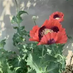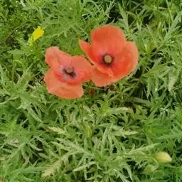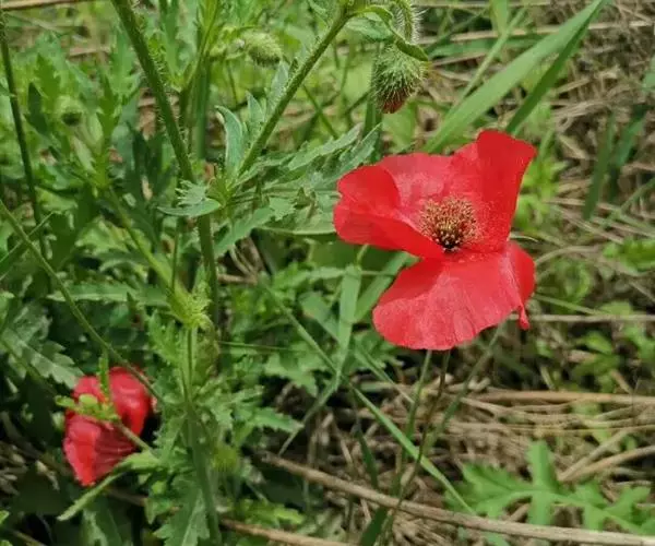 虞美人(学名:Papaver rhoeas L.):一年生草本植物,全体被伸展的刚毛,稀无毛。茎直立,高25-90厘米,具分枝。叶片轮廓披针形或狭卵形,羽状分裂,裂片披针形。花单生于茎和分枝顶端,花蕾长圆状倒卵形,下垂;萼片2,宽椭圆形;花瓣4,圆形、横向宽椭圆形或宽倒卵形,长2.5-4.5厘米,全缘,稀圆齿状或顶端缺刻状,紫红色,基部通常具深紫色斑点。蒴果宽倒卵形,长1-2.2厘米,无毛,具不明显的肋。种子多数,肾状长圆形,长约1毫米。花果期3-8月。