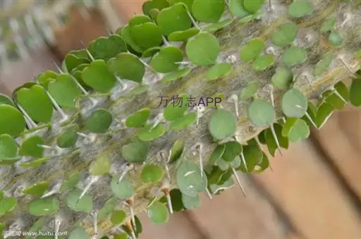 多年生常绿肉质化木本灌木或小乔木。亚龙木形态奇特,灰白色的茎干上遍布棘刺,叶片生于其间。植株在原产地可长到3~5米高,但分枝很少。茎干表皮白色至灰白色,具细锥状刺,肉质叶长卵形至心形,常成对生长,大叶绿色,小叶灰黑色。花序长30厘米左右,小花黄色或白绿色。