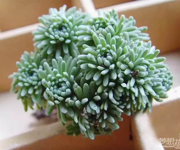植株低矮,多分枝,株型近似球状,老茎灰白色,新枝浅绿色,以后逐渐转为灰褐色,肉质叶近似针状,但稍宽,长约1cm,簇生于枝头,绿色,老叶干枯后贴在枝干上,形成类似松树皮般的龟裂,很久才脱落,露出光滑的肉质茎。小花黄色,星状。