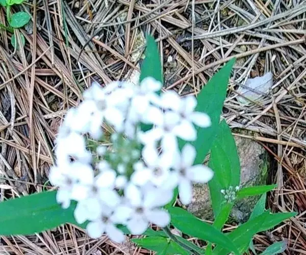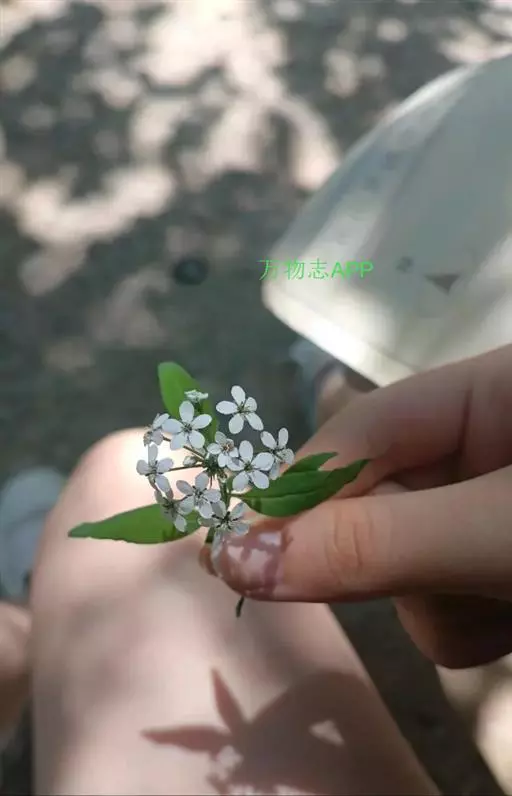 总状花序顶生,初时因花密集而成圆头状,后渐伸长,果时长4-13厘米;苞片钻形。长5-6毫米;花梗长5-10毫米;花萼长2.5-3毫米,下部合生达全长的1/3或近1/2,裂片狭三角形,边缘膜质;花冠白色,长约5毫米,基部合生仅0.3毫米,近于分离,裂片匙形或倒披针形,先端圆钝;雄蕊比花冠短,花丝贴生于花冠裂片的近中部,分离部分长约0.5毫米;花药卵圆形,长约1毫米;花粉粒具3孔沟,长球形 [(23.5-24.5) × (15-17.5)微米],表面具网状纹饰;子房无毛,花柱长约2毫米。蒴果球形,直径2-3毫米。