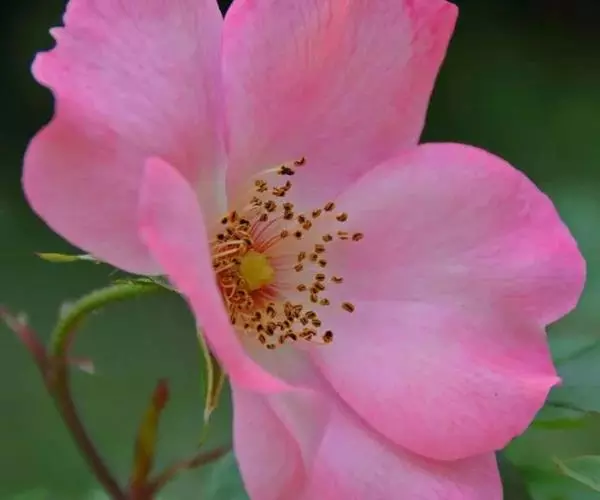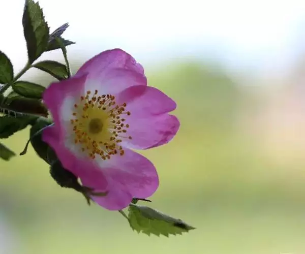花单生或2-3朵集生,苞片卵状披针形,先端渐尖,边缘有腺齿,无毛;花梗长5-10毫米,花梗和萼筒被腺毛;花直径4-5厘米;萼片卵状披针形,全缘,先端延长成带状,外面近无毛而有腺毛,内面密被柔毛,边缘较密;花瓣粉红色,宽倒卵形,先端微凹,基部楔形;花柱离生,密被长柔毛,比雄蕊短很多。