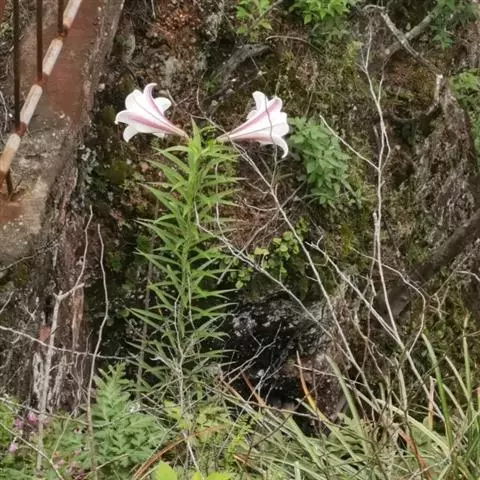 花单生或数朵排成总状花序或近伞房花序、伞形总状花序;苞片叶状,披针形,长2.5-4厘米,宽4-6毫米;花梗长10-22厘米;花下垂,有香味,白色或粉红色,有紫色斑点;花被片反卷,长4.5-6厘米,宽1.2-1.4厘米,蜜腺两边有乳头状突起;花丝长3.5厘米,无毛,花药窄矩圆形,长约1厘米,黄色;子房圆柱形,长1.2厘米,宽1.5-3毫米;花柱长为子房的2倍或更长,柱头膨大。