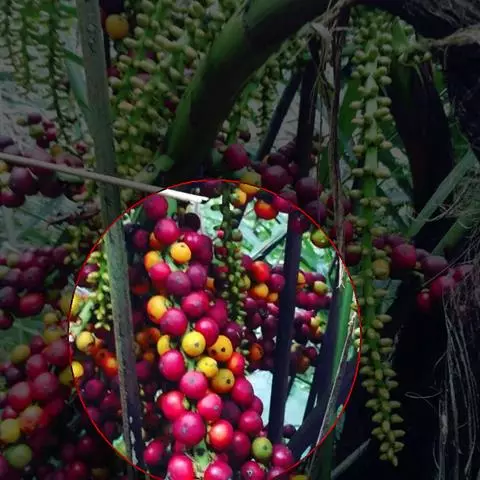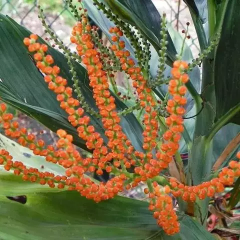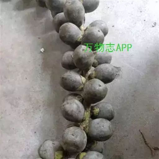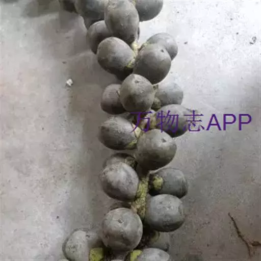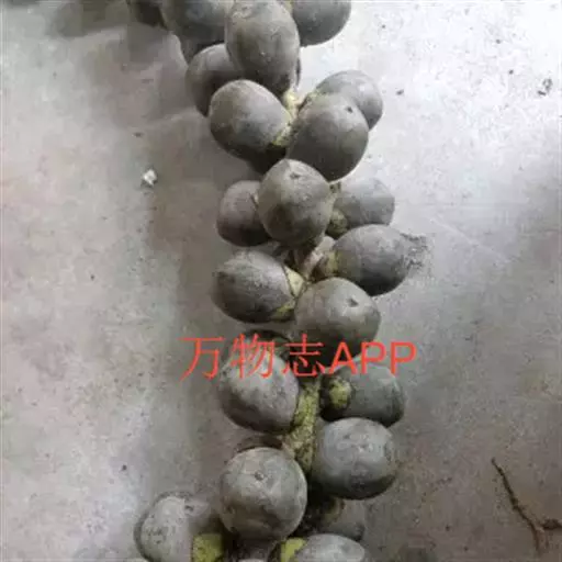 花序腋生,从上部往下部抽生几个花序,当最下部的花序的果实成熟时,植株即死亡;花序长90-150厘米,花序梗粗壮,下弯,分枝多,长达1.5米,佛焰苞多个,螺旋状排列于花序梗上;雄花大,长1.5-2厘米,花萼、花瓣各3片,雄蕊多达100枚以上;雌花花萼及花瓣各3片,花后膨大。果实近球形,直径4-5厘米,具三棱,顶端凹陷,灰褐色(未熟果实干后呈黑色)。种子3颗,黑色,卵状三棱形, 悬胚乳均匀,胚背生。花期6月,果实约在开花后2-3年时间成熟。