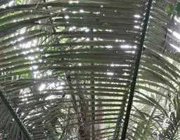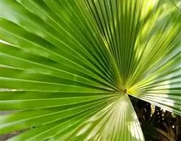 桄榔 乔木状,茎较粗壮,高5米至10余米,直径15-30厘米,有疏离的环状叶痕。叶簇生于茎顶,长5-6米或更长,羽状全裂,羽片呈2列排列,线形或线状披针形,长80-150厘米,宽2.5-6.5厘米或更宽,基部两侧常有不均等的耳垂,顶端呈不整齐的啮蚀状齿或2裂,上面绿色,背面苍白色;叶鞘具黑色强壮的网状纤维和针刺状纤维。