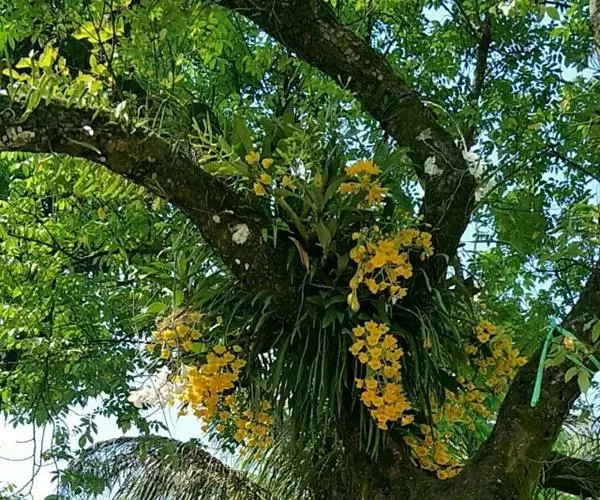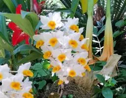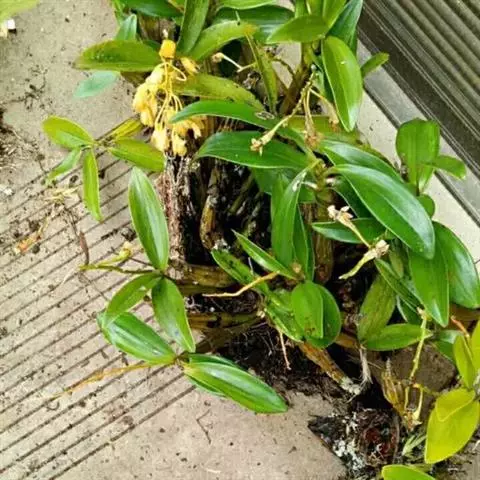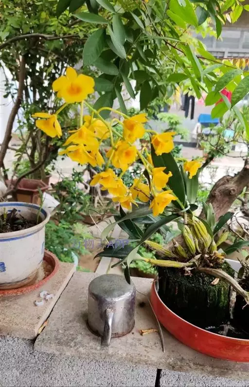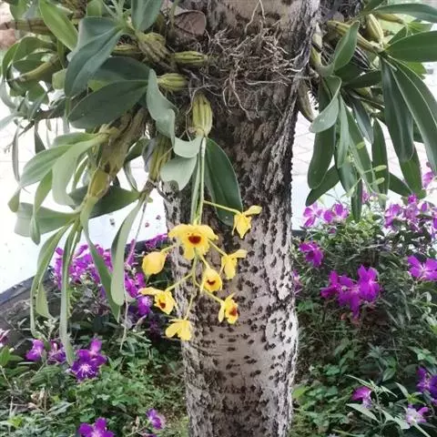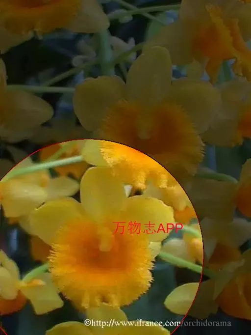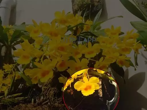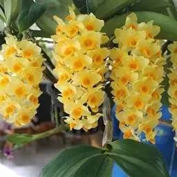 鼓槌石斛(学名:Dendrobium chrysotoxum Lindl.):茎直立,肉质,纺锤形,具2-5节间,具多数圆钝的条棱,近顶端具2-5枚叶。叶革质,长圆形。总状花序近茎顶端发出,斜出或稍下垂,长达20厘米;花质地厚,金黄色,稍带香气;花瓣倒卵形,等长于中萼片,宽约为萼片的2倍,先端近圆形,具约10条脉;唇瓣的颜色比萼片和花瓣深,近肾状圆形。花期3-5月。