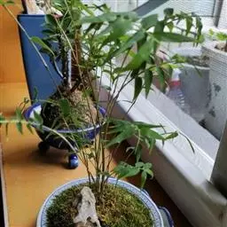 凤尾竹 Raeusch. ex Schult. ’Fernleaf’ R. A. Young)是禾本科,簕竹属孝顺竹的变种。植株较高大,杆高可达6米,竿中空,小枝稍下弯,下部挺直,绿色;竿壁稍薄;节处稍隆起,无毛;叶鞘无毛,纵肋稍隆起,背部具脊;叶耳肾形,边缘具波曲状细长繸毛;叶舌圆拱形,叶片线形,上表面无毛,下表面粉绿而密被短柔毛,小穗含小花,中间小花为两性;外稃两侧稍不对称,长圆状披针形,先端急尖;内稃线形,脊上被短纤毛,花药紫色,子房卵球形,羽毛状。成熟颖果未见。原产中国,华东、华南、西南以至台湾、香港均有栽培。凤尾竹喜温暖、湿润和阳光充足的环境,耐寒。宜土层深厚、肥沃、疏松的微酸性壤土。该种观赏价值较高,宜作庭院丛栽,也可作盆景植物。全草或根入药,味淡、微苦,性寒,有清热利湿、凉血止血、消肿解毒功效,可治痢疾、泄泻等多种病症。凤尾
