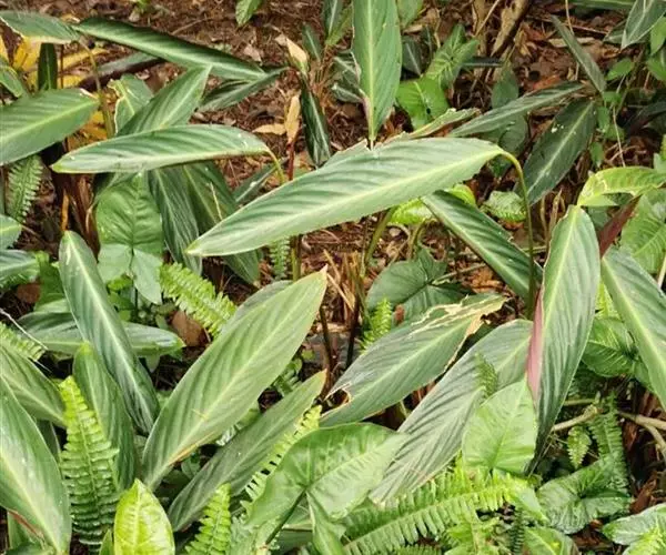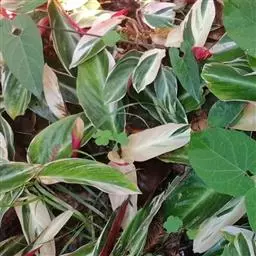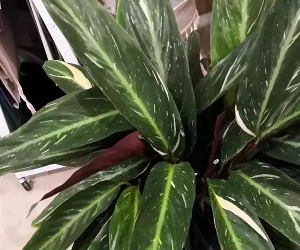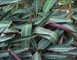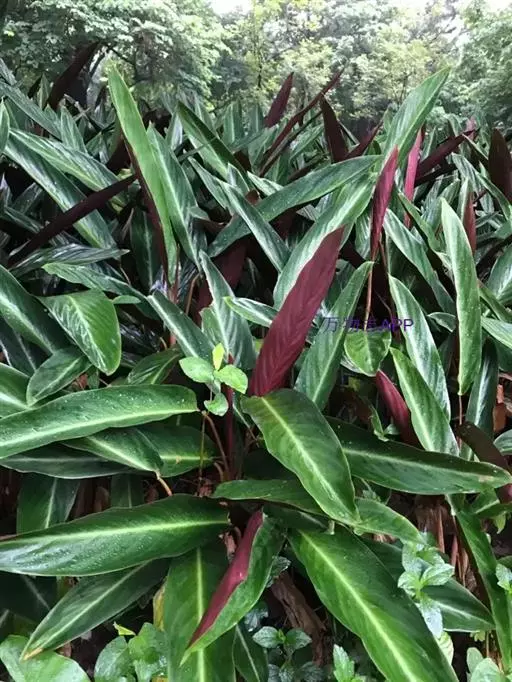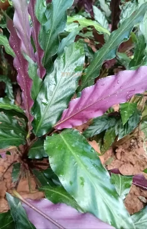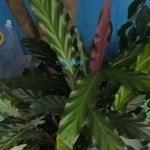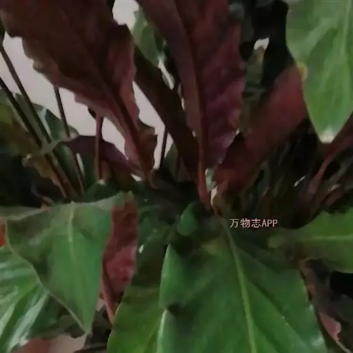 紫背竹芋(学名:Stromanthe sanguineaSond.):竹芋科,花竹芋属,多年生草本植物。株高可达80厘米,直立。叶片长卵形或披针形。它枝叶生长茂密、株形丰满,厚革质,叶面深绿色有光泽,中脉浅色,叶背血红色,形成鲜明的对比。穗状花序,苞片及萼鲜红色,花瓣白色。背部呈紫红色。