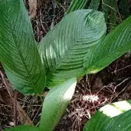 叶在基部簇生,具短柄,叶片长椭圆形至宽披针形,叶长30厘米至40厘米,宽8厘米至12厘米,叶面深绿色,有光泽,叶背紫褐色。