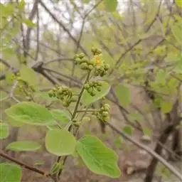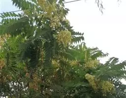 圆锥花序长20-35厘米,多花密集,被灰黄色微柔毛,分枝开展,最基部分枝长6-15厘米;苞片披针形,长约1.5毫米,被微柔毛;花小,杂性,黄色或淡黄色;花梗长1.5-3毫米,具节;萼片卵状披针形,长2.5-3毫米,宽约1.5毫米,渐尖,外面被微柔毛,边缘具细睫毛;花瓣长圆形或长圆状披针形,长3.5-4毫米,宽约1.5毫米,无毛,里面具3-5条棕褐色突起的脉纹,开花时外卷;花盘膨大,肉质,5浅裂;雄蕊仅1个发育,长约2.5毫米,花药卵圆形,不育雄蕊3-4,具极短的花丝和疣状花药原基或缺;子房斜卵形,径约1.5毫米,无毛,花柱近顶生,长约2.5毫米。