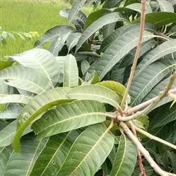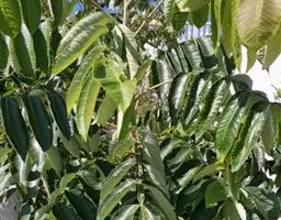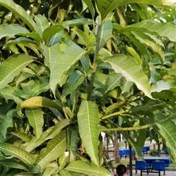 芒果 常绿大乔木,高10-20米;树皮灰褐色,小枝褐色,无毛。叶薄革质,常集生枝顶,叶形和大小变化较大,通常为长圆形或长圆状披针形,长12-30厘米,宽3.5-6.5厘米,先端渐尖、长渐尖或急尖,基部楔形或近圆形,边缘皱波状,无毛,叶面略具光泽,侧脉20-25对,斜升,两面突起,网脉不显,叶柄长2-6厘米,上面具槽,基部膨大。