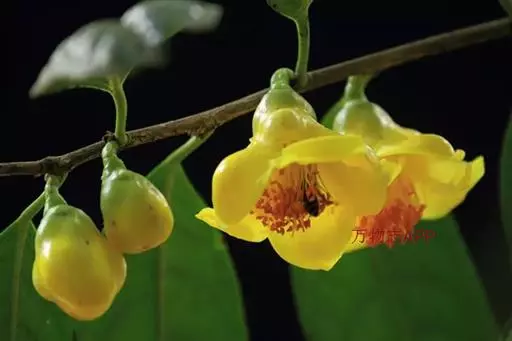 花黄色,腋生,单独,花柄长7~10毫米;苞片5片,散生,阔卵形,长2~3毫米,宽3~5毫米,宿存;萼片5片,卵圆形至圆形,长4~8毫米,宽7~8毫米,基部略连生,先端圆,背面略有微毛;花瓣8~12片,近圆形,长1.5~3厘米,宽1.2~2厘米,基部略相连生,边缘有睫毛;雄蕊排成4轮,外轮与花瓣略相连生,花丝近离生或稍连合,无毛,长1.2厘米;子房无毛,3~4室,花柱3~4条,无毛,长1.8厘米。