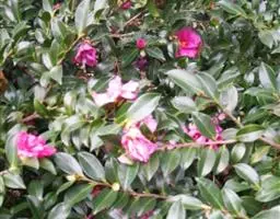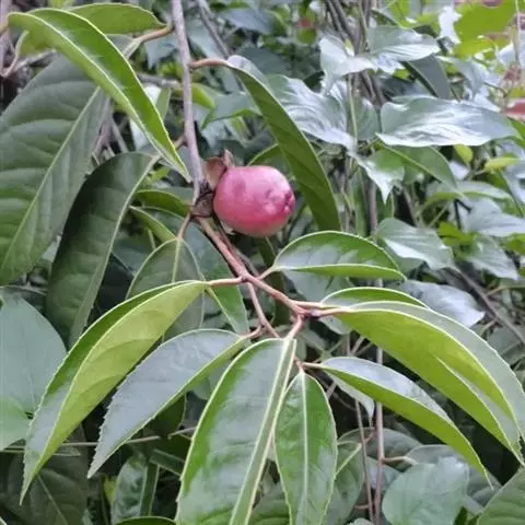 常绿灌木,高3米,嫩枝淡红色,无毛。嫩叶淡紫红色,老叶椭圆形或长椭圆形,先端急尖,基部宽楔形。花为淡黄色或略带粉红色,1-3朵成腋生或顶生,花径1.5 -2.5厘米;花朵有花瓣6-8片;子房3室,被灰白色短柔毛;花柱3条,完全分离,无毛;花期10-12月。蒴果扁球形,通常3室,每室有种子1-2粒,褐色,无毛。主要分布于广西宁明县;生于海拔190-350米的酸性土山杂木林中。本物种可作杂交育种的亲本。