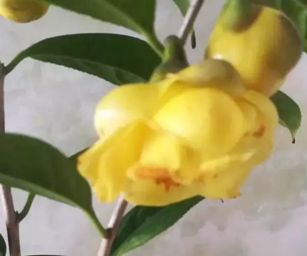 常绿灌木,高3米;嫩枝淡红色,无毛。嫩叶淡紫红色,老叶椭圆形,先端渐尖,基部楔形,叶缘近全缘,仅先端有时出现不明显的细锯齿。花为黄色,单生于叶腋或枝顶,花径2.5-4.5厘米;花朵有花瓣10- 13片,其蜡质光泽不明显;子房3室,无毛;花柱3条,完全分离,无毛。花期 12月至次年3月。主要分布于广西扶绥县中东乡;生于海拔120- 230米的石灰岩的杂木林中。本物种是杂交育种的良好亲本,可培育出黄色茶花新品种。