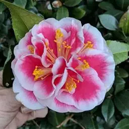 常绿灌木,高3米。本变种与原变种淡黄金花茶近似,其主要区别在于花朵的花瓣较多,多达23-30片,长圆形或条形,其中有9- 10片呈红色,14-20片呈淡黄色,内轮花瓣较长,外轮花瓣较短,观赏价值高。花期 10月次年3月。主要分布于广西龙州县;生于海拔 100-250米的石灰岩山钙质土上的杂木林中。本变种是杂交育种的良好亲本,可培育出多种花色的重瓣茶花新品种。