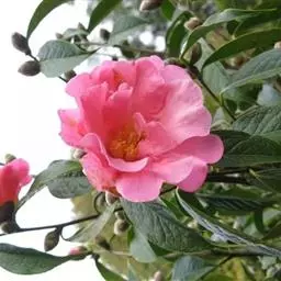 常绿灌木,高2-3米;嫩枝无毛。嫩叶紫红色,老叶椭圆形,先端尾状渐尖,基部宽楔形。花为黄色,有香气,1-2朵成顶生或腋生,花径4-4.5厘米;花朵有花瓣7-8片;子房下半部无毛,顶端有白色柔毛;花柱顶端3裂。花期10-12月。蒴果扁球形,种子被长柔毛。主要分布于贵州册亨县;生于海拔660米的砂岩山谷的杂木林中。本物种是杂交育种的亲本,可培育出具有芳香的黄色茶新品种。