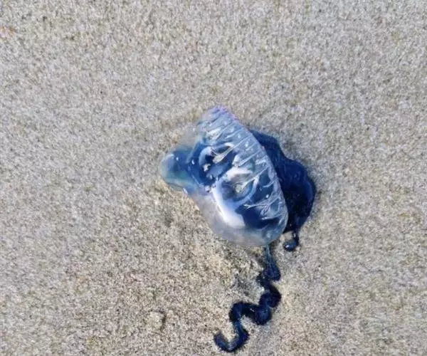 僧帽水母是腔肠动物的一种,它属于水螅虫纲,呈蓝青色,浮囊两头尖,底平,形如僧侣的帽子,因而名叫“ 僧帽水母”。它的浮囊上有发光的膜冠,能自行调节方向,借风像帆船似的在水面漂行。