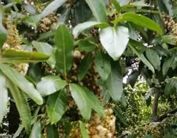 叶片革质,近于无柄,细小,卵状披针形,长2-5厘米,宽1-1.5厘米,先端钝而渐尖,或钝而略尖,基部微心形,上面干后灰绿色或灰褐色,无光泽,下面稍浅,侧脉12-16对,在上面明显,在下面隐约可见,近于水平斜出,边脉极靠近边缘,侧脉间相隔约1.5毫米。