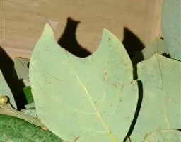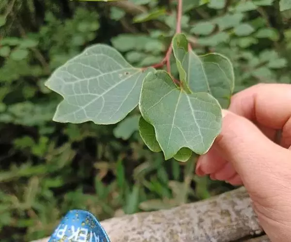 叶互生,近圆形至扁圆形,长5.5-10厘米,宽4.8-10.8厘米,先端急尖,全缘或3裂,常明显3裂,基部近圆形或心形,有时宽楔形,上面深绿,下面绿苍白色,有时带红色,被棕黄色柔毛或近无毛;三出脉,偶有五出脉,网脉明显;叶柄长1.5-2.8厘米,被黄白色柔毛。