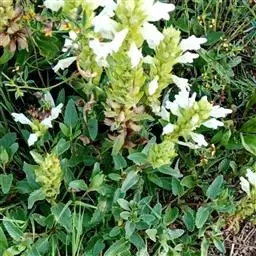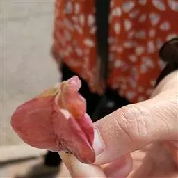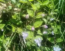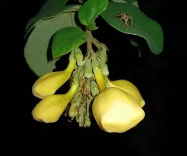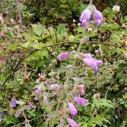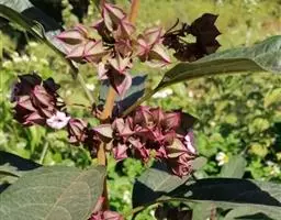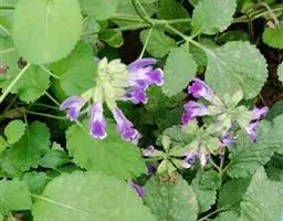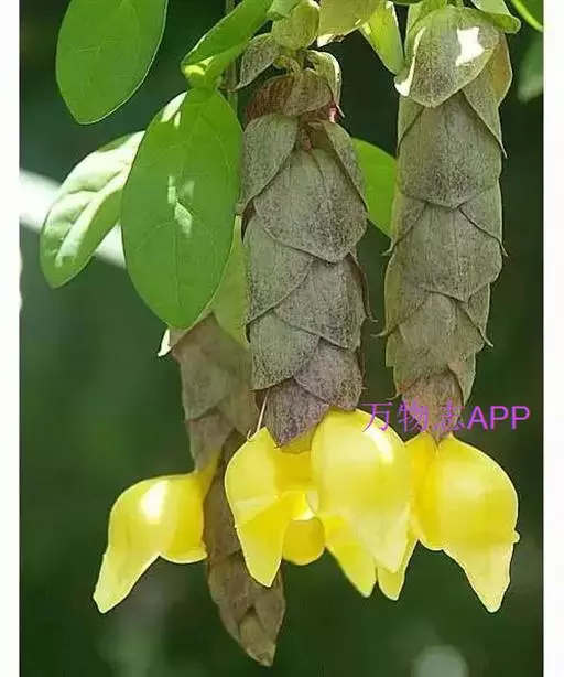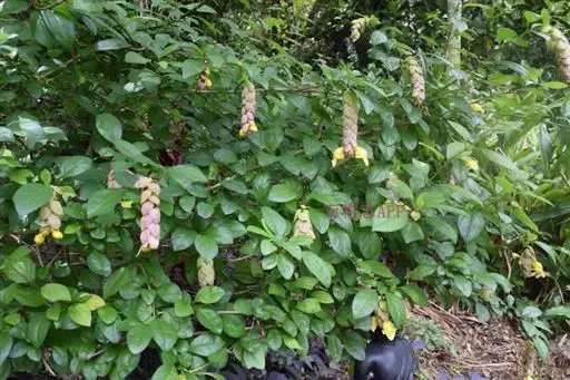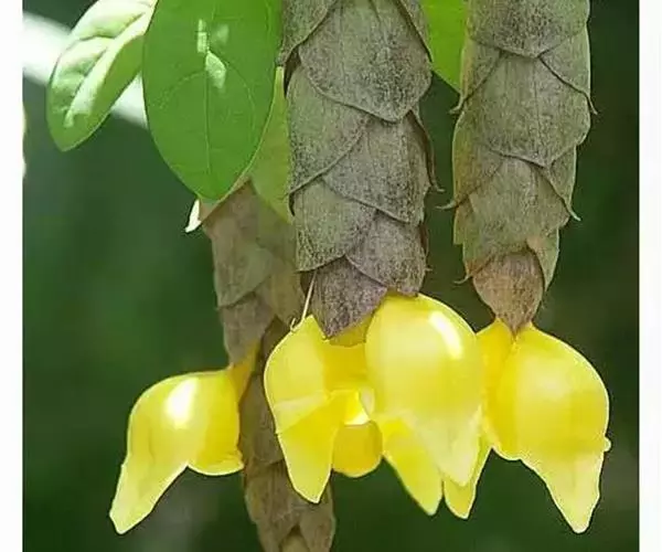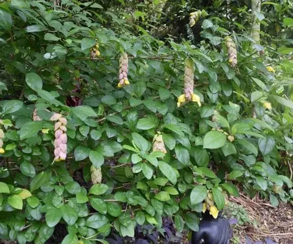 总状花序顶生,悬垂性,花冠2唇形,两侧对称,褐紫色叶状苞片;小花长5.5公分,外部被毛,上部特别阔 大,下部狭细管状,冠端4裂,有1片比较大,其它3片小形,,叶状苞片生于花的顶部,阔卵、卵或是倒卵形,苞端钝,脉纹显著,长4公分、宽3公分;绿色花萼杯形,先端截形或边缘具有4~5浅齿,外侧常会具有2~4粒大型腺体。