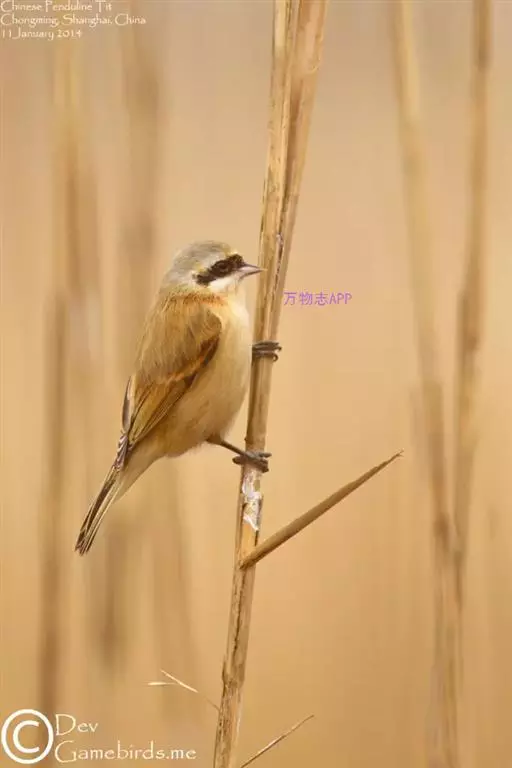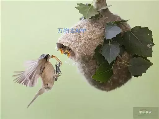 中华攀雀(学名:Remiz consobrinus):体重7.5-11克,体长100-115毫米。体型纤小,雄鸟顶冠灰,脸罩黑,背棕色,尾凹形。雌鸟及幼鸟似雄鸟但色暗,脸罩略呈深色。 虹膜深褐色,嘴灰黑色,脚蓝灰色。