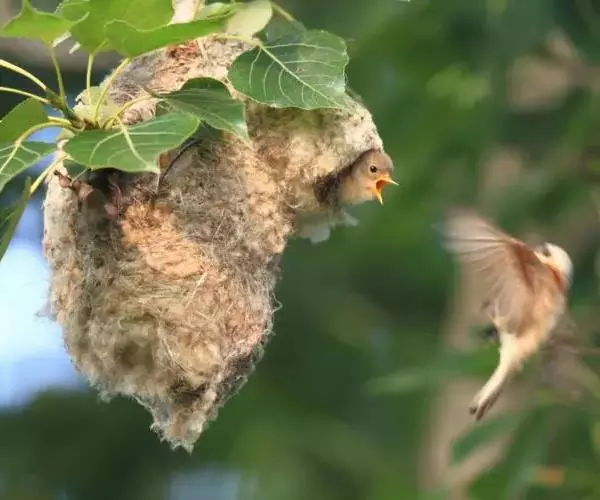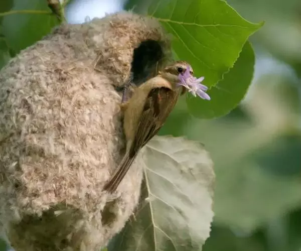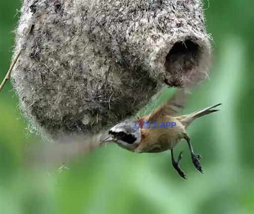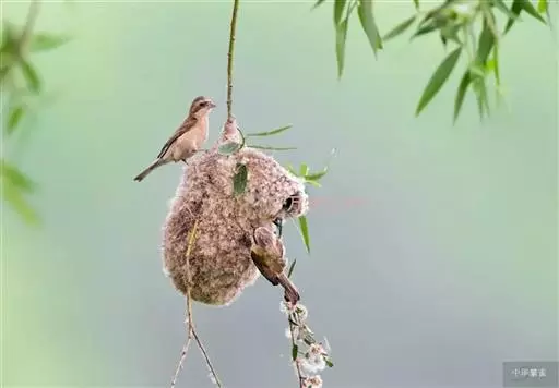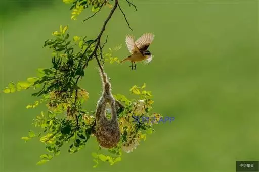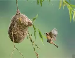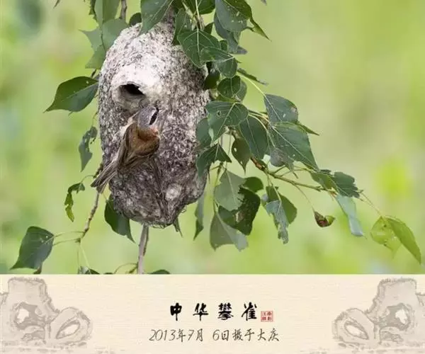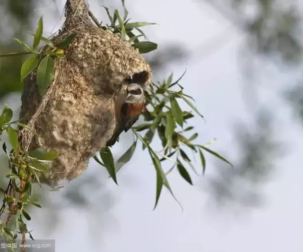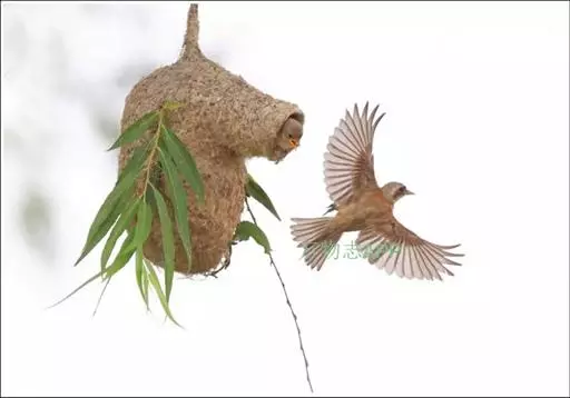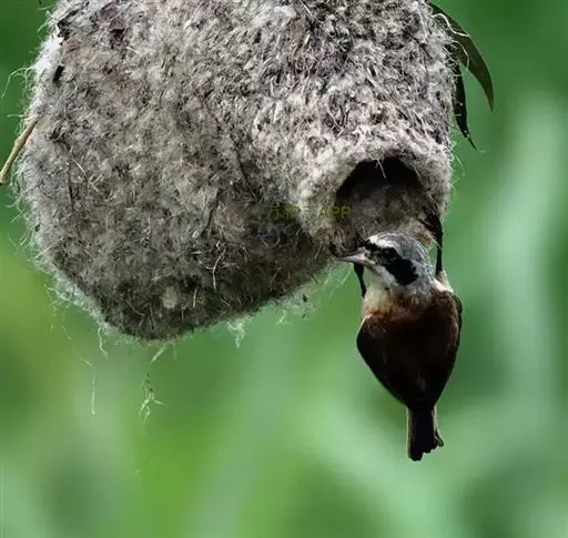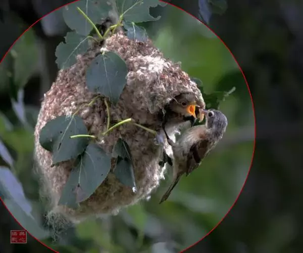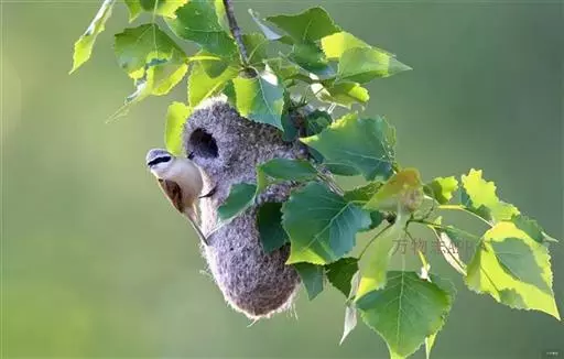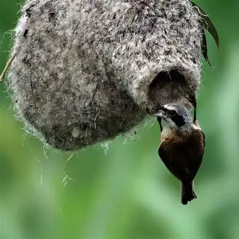 巢呈囊袋状,主要由树皮纤维、羊毛、蒲绒、杨絮、柳絮等编织而成,结构相当精巧,悬吊于乔木柔软的细枝末梢,很像一个悬挂的葫芦。巢顶端侧面月一管状开口,供亲鸟出入。营巢基本完成,但以后仍不断在内壁用杨絮和柳絮加厚,直到产卵期间亦不停止。每个巢从开始营造到最后完成需要8-12天。巢的大小为长12-16.5厘米,宽8.4-10.5厘米,深8.5-10厘米,外径3-4.5厘米,巢口内径2-3.8厘米,巢口管长0.9-4厘米。