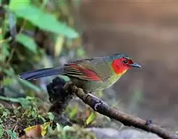 雌鸟额、眼先,经眼下部和颊上部到耳羽暗棕栗色,上体沙褐色,头顶灰色稍深具淡褐色羽干纹,其余与雄鸟相似,但羽色略淡而少光泽。