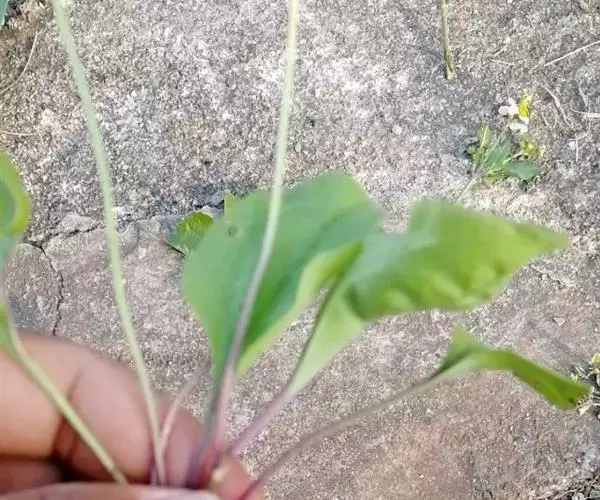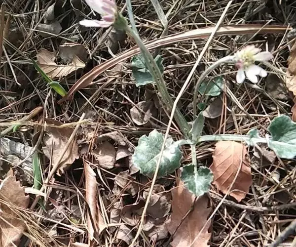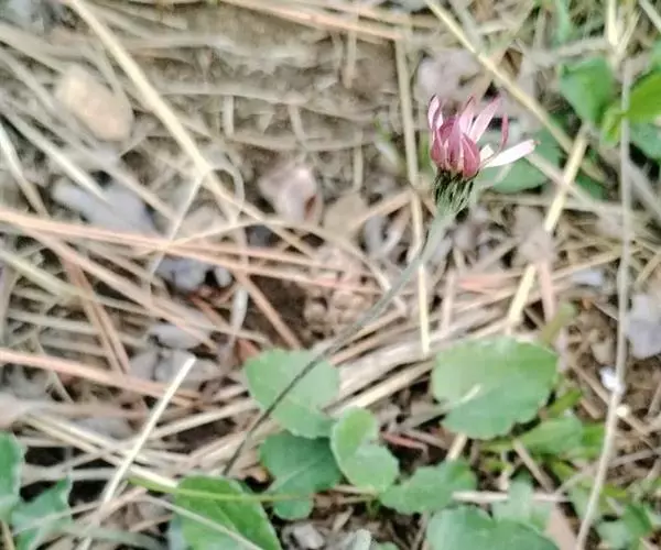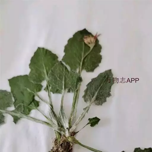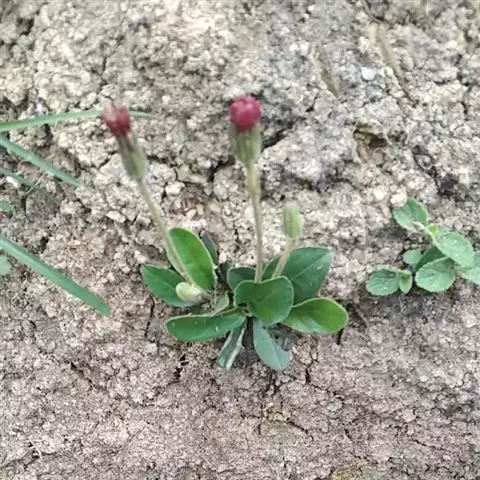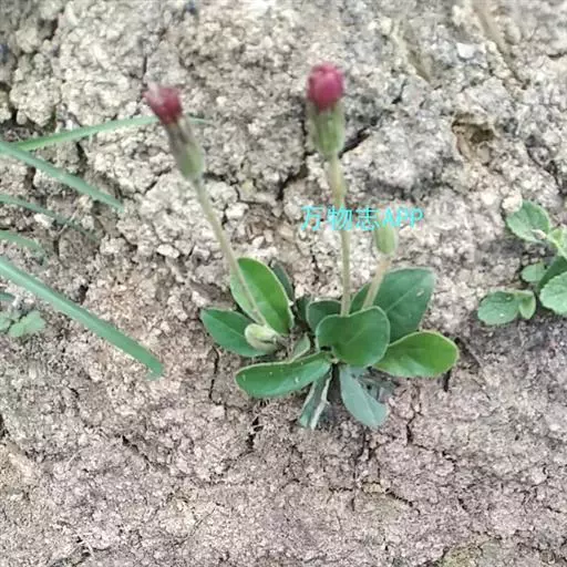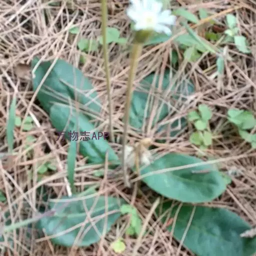 头状花序单生于花葶之顶,倒锥形,直径10-15毫米;总苞略短于冠毛;总苞片约3层,外层线形,长约4毫米,内层长,线状披针形,长达8毫米,二者顶端均钝,且带紫红色,背部被绵毛;花托平,无毛,直径3-4毫米;雌花花冠舌状,长10-12毫米,舌片长圆形,长6-8毫米,顶端具不整齐的3齿或有时钝圆,带紫红色,内2裂丝状,长1.5-2毫米,花冠管纤细,长3-4毫米,无退化雄蕊。两性花花冠管状二唇形,长6-8厘米,外唇阔,长约3毫米,顶端具3齿,内唇2裂丝状,长2.5-3毫米;花药顶端圆,基部具尖的尾部;花柱分枝长约1毫米,内侧扁,顶端钝圆。瘦果纺锤形,具纵棱,被白色粗毛,长5-6毫米;冠毛粗糙,污白色,长5-7毫米。秋型者植株较高,花葶长可达30厘米,叶片大,长8-15厘米,宽4-6.5厘米,头状花序外层雌花管状二唇形,无舌片。花期春、秋二季。