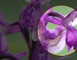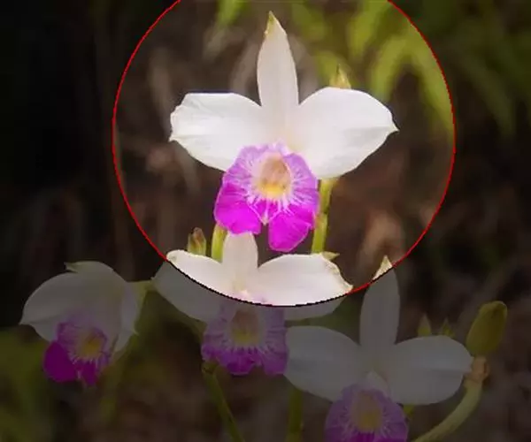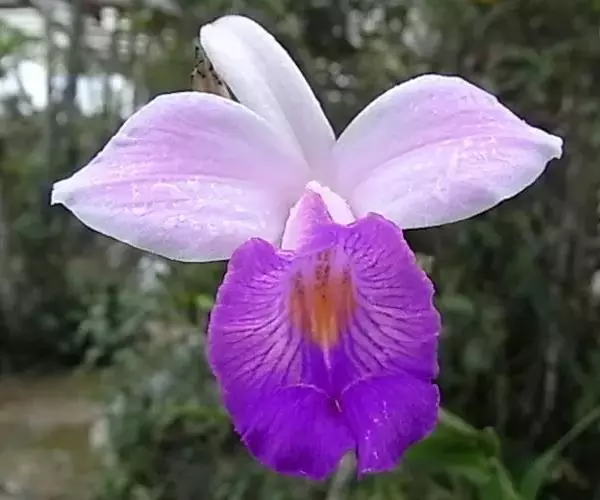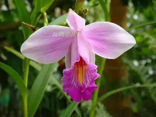 花序通常长2-8厘米,总状或基部有1-2个分枝而成圆锥状,具2-10朵花,但每次仅开1朵花;花苞片宽卵状三角形,基部围抱花序轴,长3-5毫米;花梗和子房长1.5-3厘米;花粉红色或略带紫色或白色;萼片狭椭圆形或狭椭圆状披针形,长2.5-4厘米,宽7-9毫米;花瓣椭圆形或卵状椭圆形,与萼片近等长,宽1.3-1.5厘米;唇瓣轮廓近长圆状卵形,长2.5-4厘米,3裂;侧裂片钝,内弯,围抱蕊柱;中裂片近方形,长1-1. 4厘米,先端2浅裂或微凹;唇盘上有3(-5)条褶片;蕊柱稍向前弯,长2-2.5厘米。蒴果近长圆形,长约3厘米,宽8-10毫米。